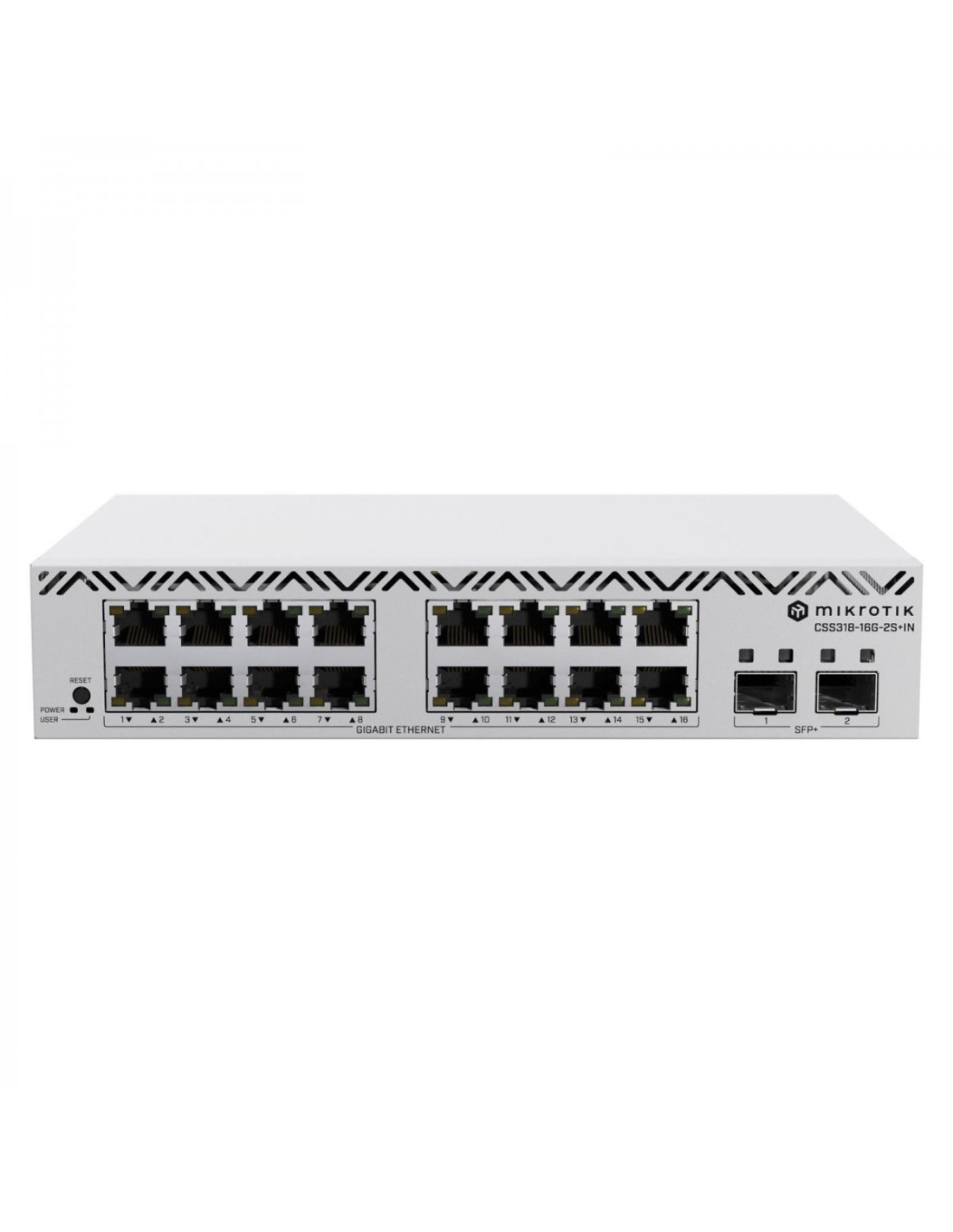 Commutateur réseau géré Mikrotik CSS318‑16G‑2S+IN : 16 ports Gigabit Ethernet, 2 ports SFP+ 10G, format rack compact, gestion SwOS.